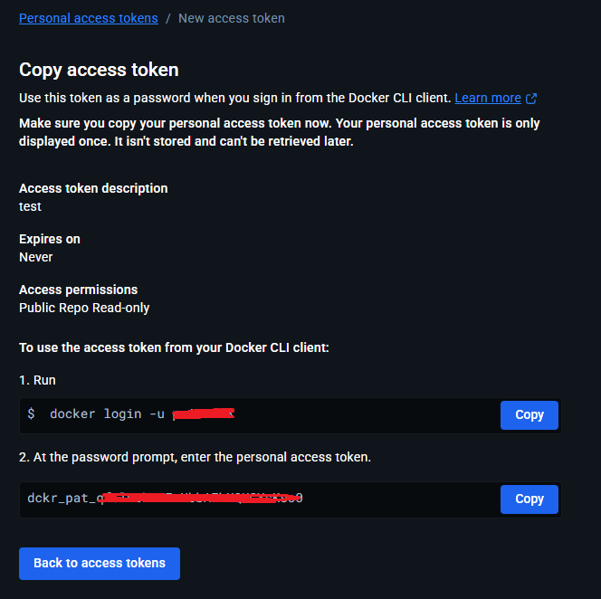 根據頁面提示,您可以使用此權杖作為密碼,透過 Docker CLI 客戶端登入: