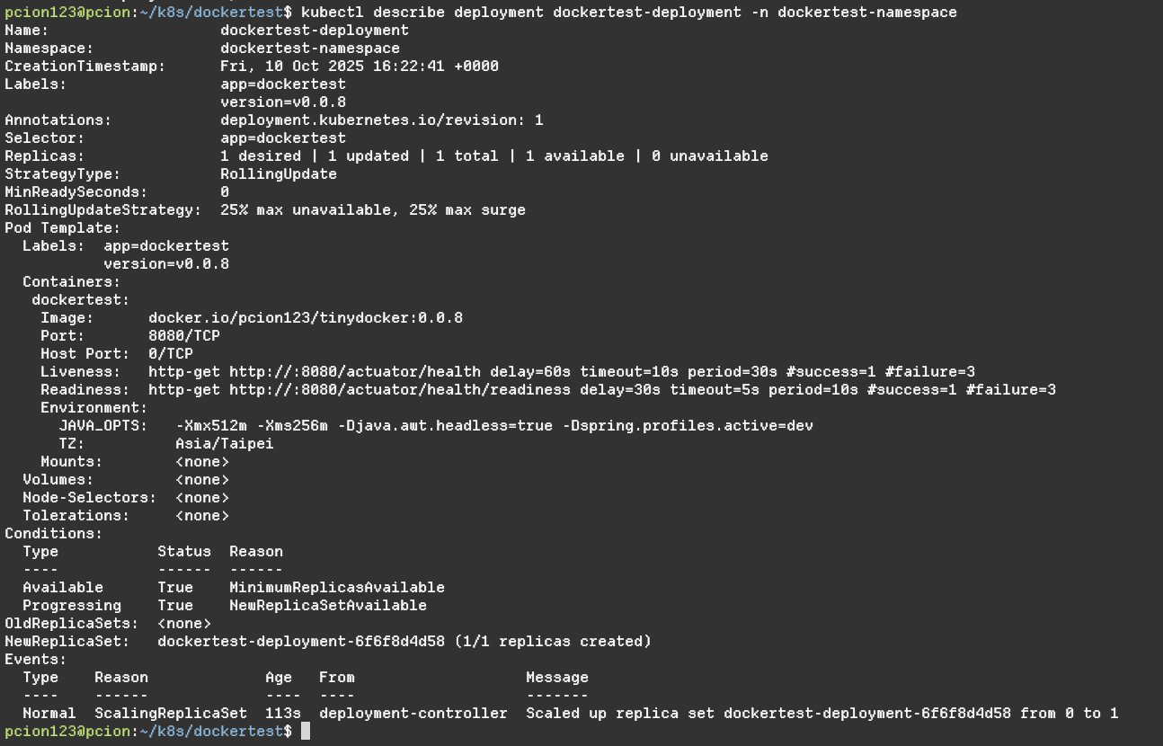 1 | kubectl describe deployment dockertest-deployment -n dockertest-namespace |