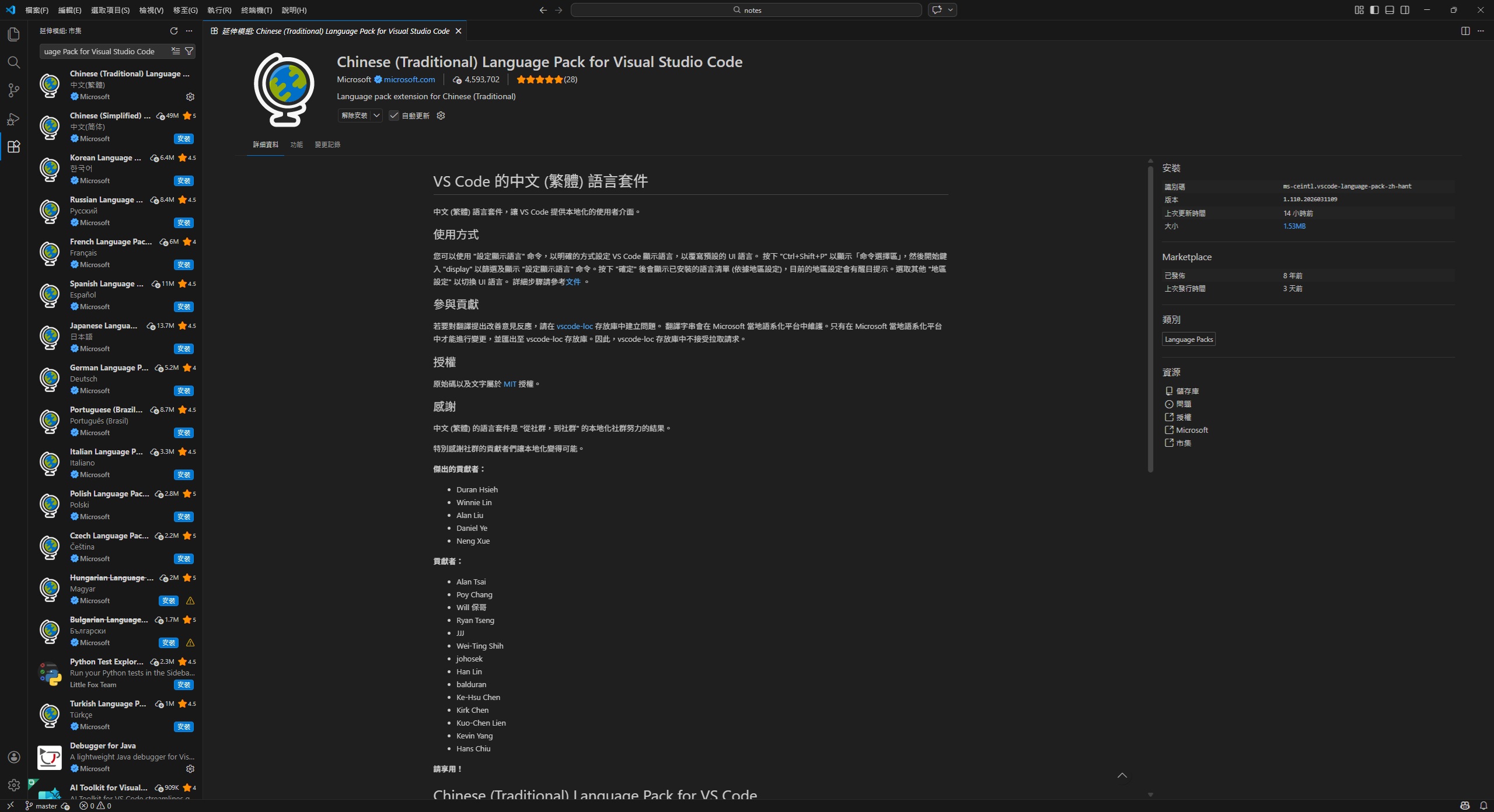 Chinese (Traditional)並安裝 Chinese (Traditional) Language Pack for Visual Studio Code - 安裝後依提示重新啟動 VSCode,介面即會切換為繁體中文